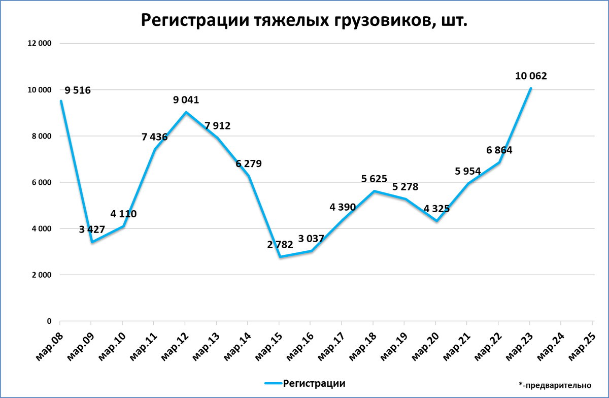 В марте 2023 года на российском рынке (по предварительным данным) было продано 10 062 тяжёлых грузовика.