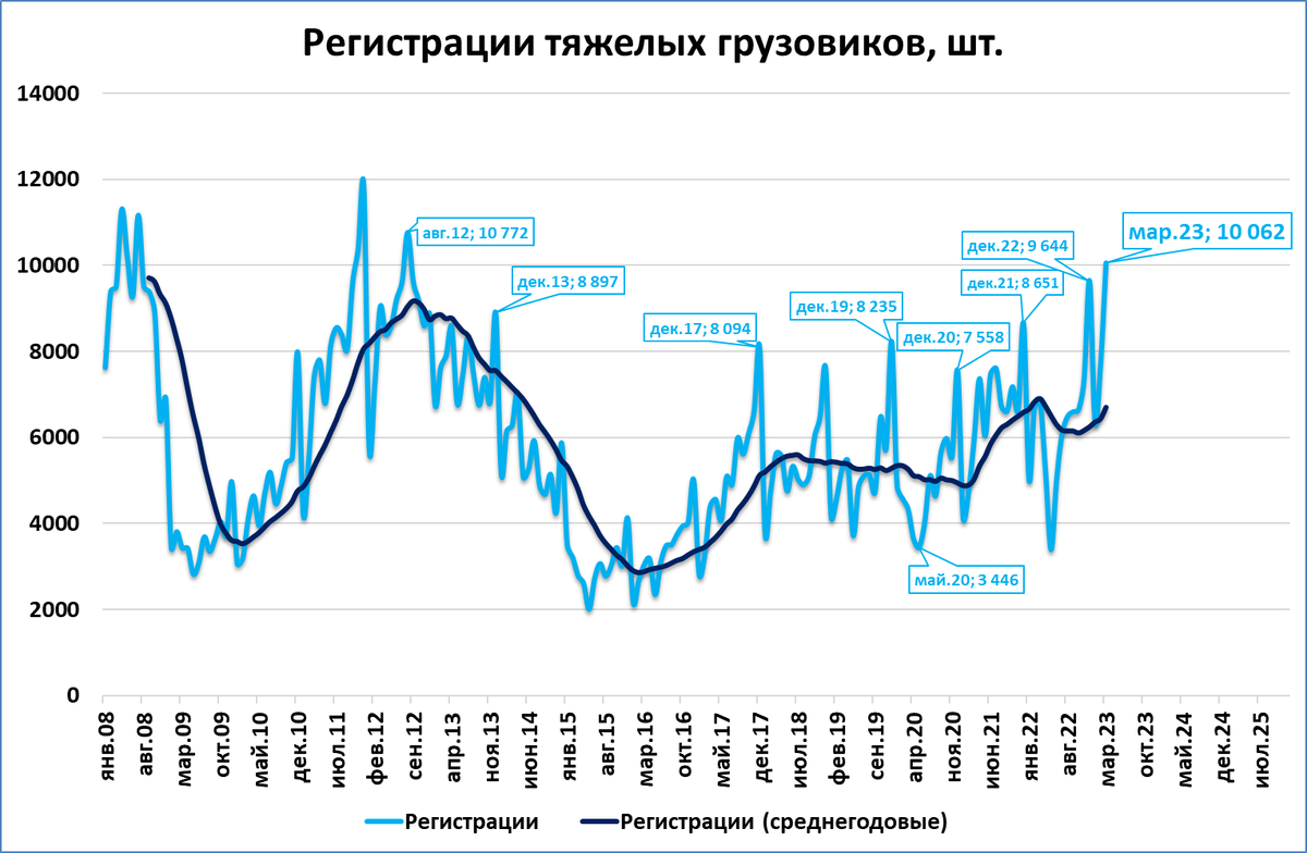 ● В марте на российском рынке было зарегистрировано более 10 тыс. тяжёлых грузовиков (предварительные данные). Для марта это максимальные значения, до этого рекордным был март 2008 года (9,5 тыс.).