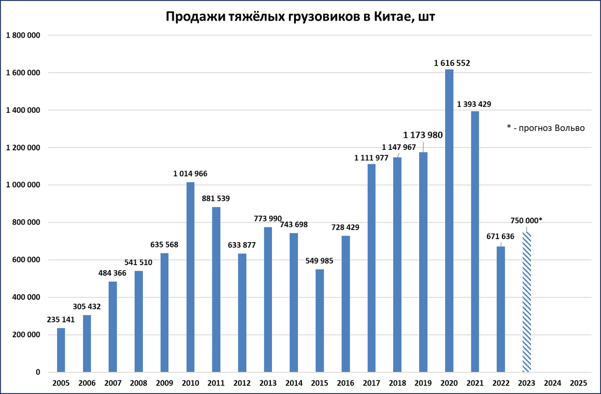 Прогноз компании “Вольво” предполагает рост рынка до 750 тыс. в 2023 году.