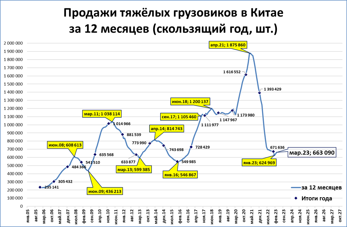 ● Китайский рынок тяжёлых грузовиков растёт в марте уже второй месяц подряд. Падение, длившееся 21 месяц (почти два года), закончилось.