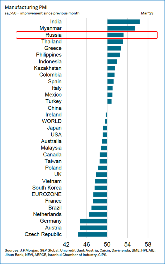 Россия сейчас находится на третьем месте в мире по деловой активности в обрабатывающей промышленности, уступая лишь Индии и Мьянме.