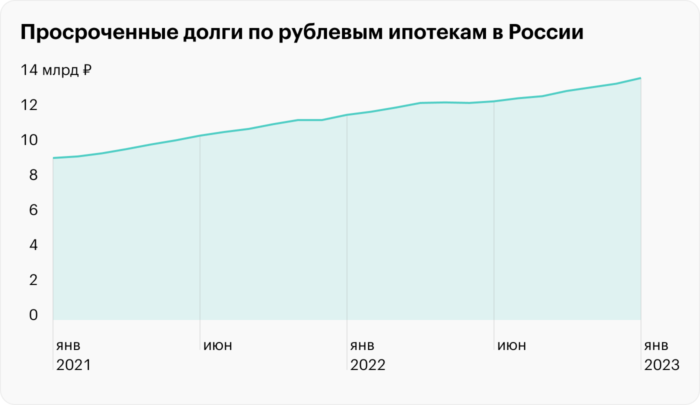 С января 2021 года, когда объем просроченных займов был около 0,8%, показатель за два года снизился в два раза: в январе 2023 года он составлял 0,4%. При этом в денежном выражении просроченные долги выросли. Источник: информационный бюллетень ЦБ РФ «Сведения о рынке ипотечного жилищного кредитования в России»