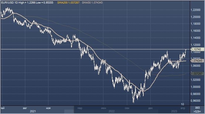 Пара EUR/USD входит в более высокий торговый диапазон благодаря центральным банкам, стимулирующим такое движение. Утром в пятницу котировки достигли 1,1074 доллара за единую валюту — максимум с 1 апреля 2022 года.