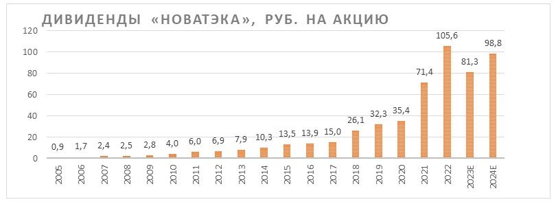 Дивидендная политика «НОВАТЭКа» предусматривает выплату 50% скорректированной чистой прибыли дважды в год. По итогам второго полугодия 2022 года СД рекомендовал выплатить 60,4 руб. на акцию, что соответствует 4,8% доходности, а дивиденды за весь год составили рекордные 105,6 руб. на акцию (8,3% доходности). При этом в 2023 году мы ожидаем снижения выплат до 81,3 руб. на акцию, что соответствует 6,4% доходности.