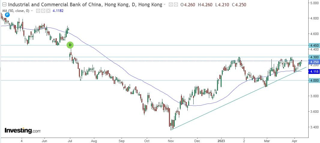 С точки зрения технического анализа на дневном графике акции ICBC класса H оттолкнулись от линии восходящего тренда. Ожидаем продолжения повышения до уровня HKD 4,3, при прохождении которого целью дальнейшего подъема станет HKD 4,45. В случае формирования нисходящего движения и ухода ниже линии тренда поддержками станут 50-дневная скользящая средняя на HKD 4,1 и далее отметка HKD 4.