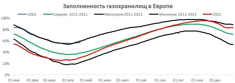 В то же время у нас умеренно негативный взгляд на акции «Газпрома». Ранее аномально высокие цены на газ могли компенсировать газовому гиганту снижение экспорта, однако сейчас это уже не так. Отопительный сезон для европейского газового рынка оказался достаточно аномальным. Теплая погода, стабильно неплохие показатели ветряной генерации и сохраняющийся повышенный объем импорта СПГ привели к тому, что заполненность газохранилищ в ЕС в конце отопительного сезона была близка к историческому рекорду.