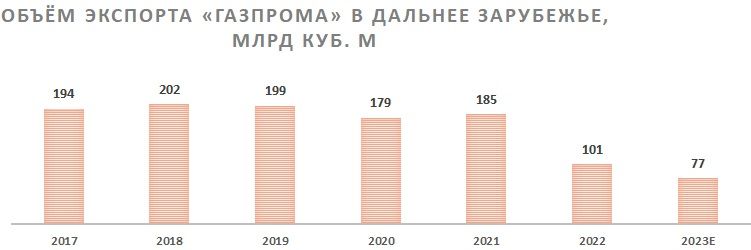 При этом бизнес «Газпрома» стал существенно меньше зависеть от состояния европейского газового рынка, так как с начала СВО ключевые маршруты поставок по очереди начали выбывать. «Северный поток — 2» сначала попал под санкции, а затем и вовсе был взорван вместе с «Северным потоком — 1», что окончательно похоронило надежды на восстановление поставок в Германию. Польский участок газопровода «Ямал — Европа» весной попал под российские санкции и не используется, несмотря на техническую возможность. Транзит через Украину продолжает работать лишь на 38% от предусмотренных договором объемов, так как представители Украины отказываются использовать тот участок газопровода, который они полностью не контролируют. Более того, существует высокая вероятность потери и этих 38%. В результате в нормальном режиме работают лишь «Турецкий» и «Голубой» потоки, а также экспорт в Китай по «Силе Сибири — 1». Из-за этих факторов по итогам 2022 года экспорта «Газпрома» в дальнее зарубежье упал на 45% (г/г) до 101 млрд кубометров, а в 2023 году, по нашим оценкам, может снизиться до 70-85 млрд кубометров.