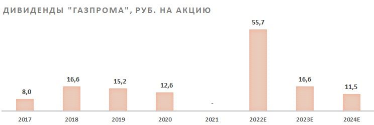 Иначе говоря, «Газпром» теряет свой наиболее прибыльный рынок значительно быстрее, чем успевает переориентироваться на новые. Также компания страдает от повышения налоговой нагрузки (дополнительный НДПИ составляет 600 млрд руб. в год), которая необходима для частичной компенсации дефицита бюджета. Из-за данных факторов размер финального дивиденда «Газпрома» за 2022 год, по нашим оценкам, может составить 4,7 руб. на акцию (2,6% доходности), а по итогам 2023 года — 16,6 руб. на акцию (9,1% доходности). Наша текущая целевая цена по акциям «Газпрома» составляет 157,8 руб. (даунсайд — 13,5%). В случае продолжения роста акций газового гиганта мы планируем снизить рейтинг по ним с «Держать» до «Продавать».