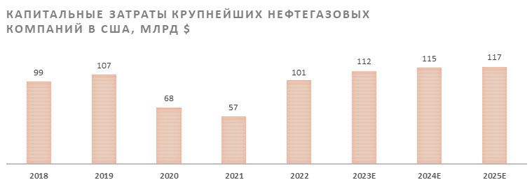 На данный момент цены на нефть продолжают находиться на повышенном уровне, а ожидания дефицита на рынке во II полугодии 2023 года на фоне восстановления спроса в Китае и действий ОПЕК+, на наш взгляд, позволят ценам закрепиться выше отметки $80 за баррель в ближайшие кварталы. Текущие цены и ожидания того, что в будущем они, как минимум, не снизятся, позволяют американским нефтяникам комфортно наращивать добычу. Прогноз EIA предполагает, что к концу 2024 года добыча ЖУВ в стране вырастет более чем на 5% до 21,8 млн барр./сут. При этом снизившаяся за последние два года долговая нагрузка многих нефтяников позволяет им переходить к постепенному росту капитальных расходов, объем которых может в 2023 году превысить уровень допандемийного 2019 года.