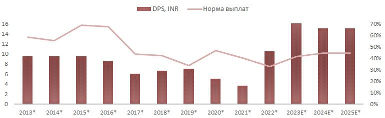 Наиболее позитивным моментом в инвестиционной истории ONGC являются высокие дивиденды. Дивидендная политика предусматривает норму выплат в 40-55% неконсолидированной чистой прибыли, и мы полагаем, что норма выплат в ближайшее время будет держаться в диапазоне 40-45% прибыли. В таком случае финальный дивиденд по итогам 2023 финансового года может составить 5,65 INR на акцию, что соответствует 3,5% доходности. При этом в 2024-2025 финансовых годах на фоне развития бизнеса и повышенных цен на углеводороды дивиденды могут остаться на высоком уровне: консенсус на 2024 год предполагает выплату 15 INR на акцию, что соответствует 9,4% доходности.