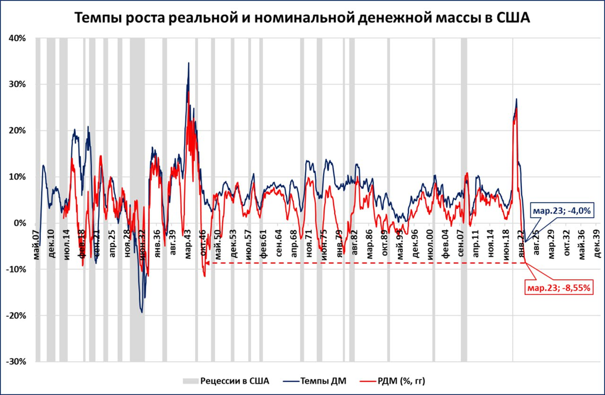 Прогноз: сжатие денежной массы (номинальной и реальной) приведёт к замедлению, а затем и к падению ВВП США, если политика ФРС не изменится.