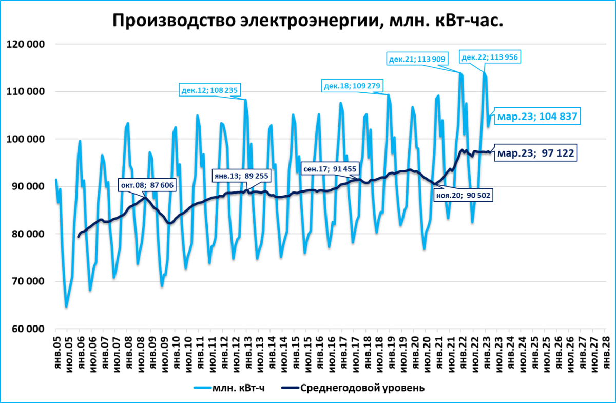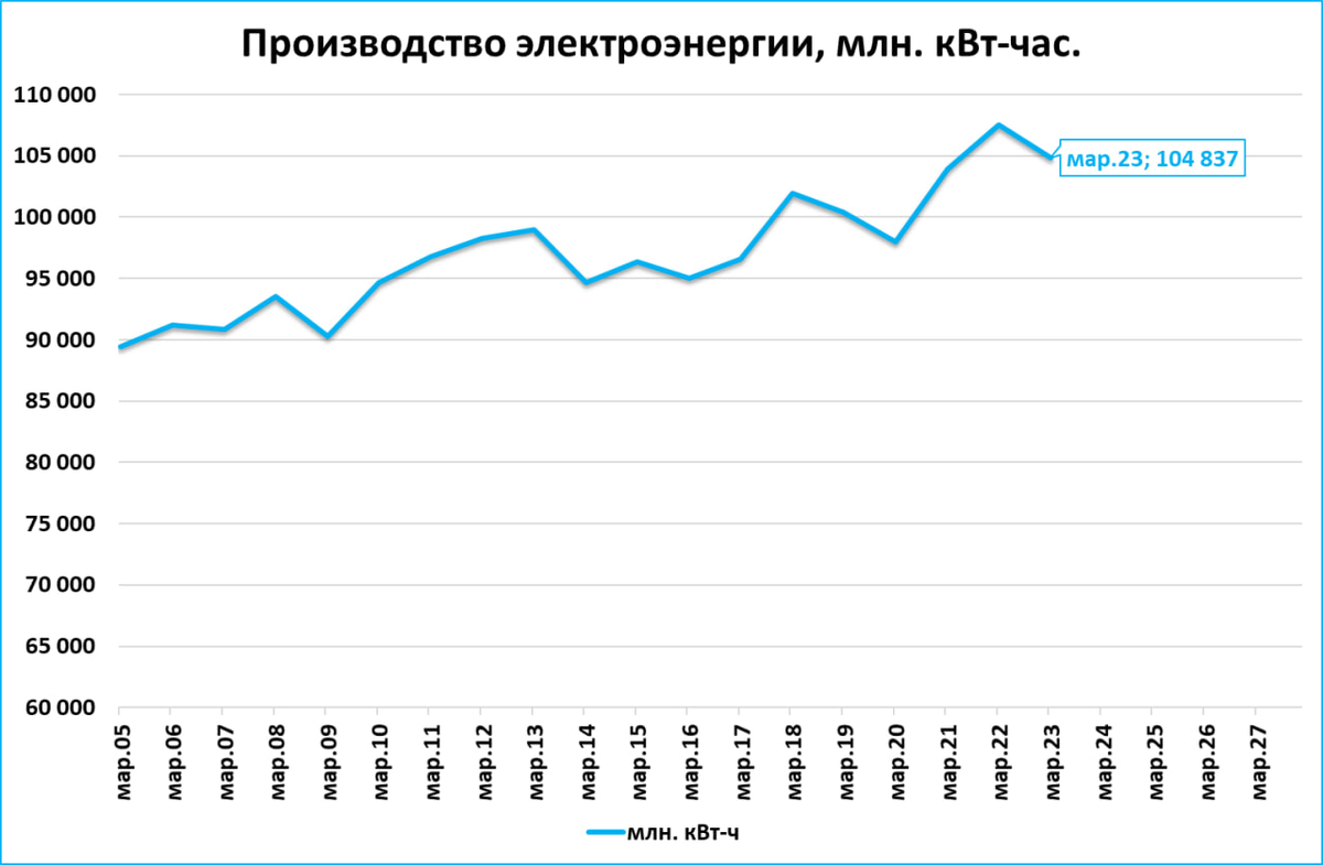 Динамика производства электроэнергии не “провалилась” в прошлом году, но роста пока не показывает. Это может объясняться температурным фактором, который в России имеет большое значение.