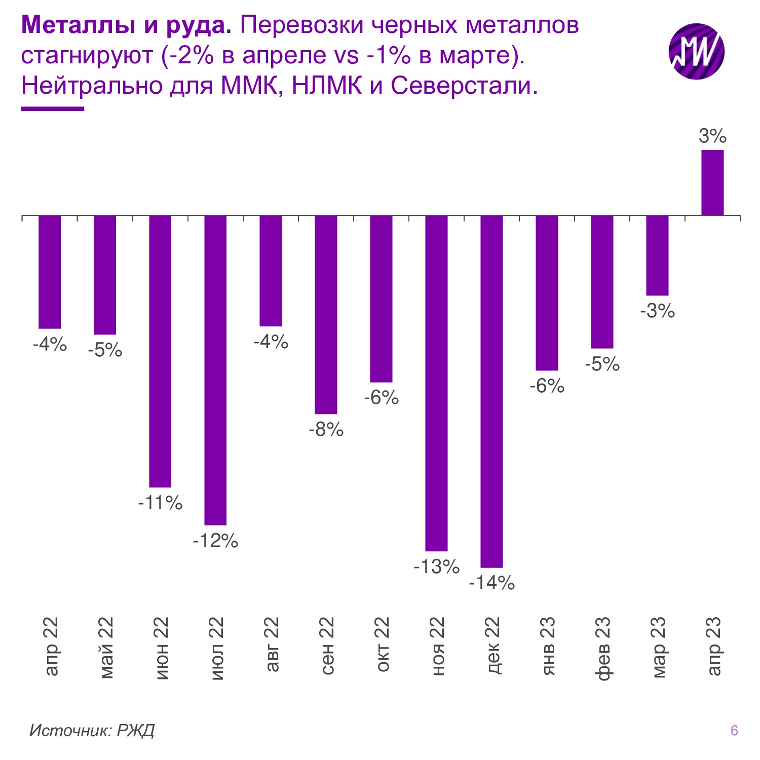 ⛓️ Черные металлы. В апреле восстановление в сегменте приостановилось (-2% г/г, vs -1% в марте). Нейтрально для компаний сектора. Предпочитаем держать экспозицию на сектор через ММК и НЛМК