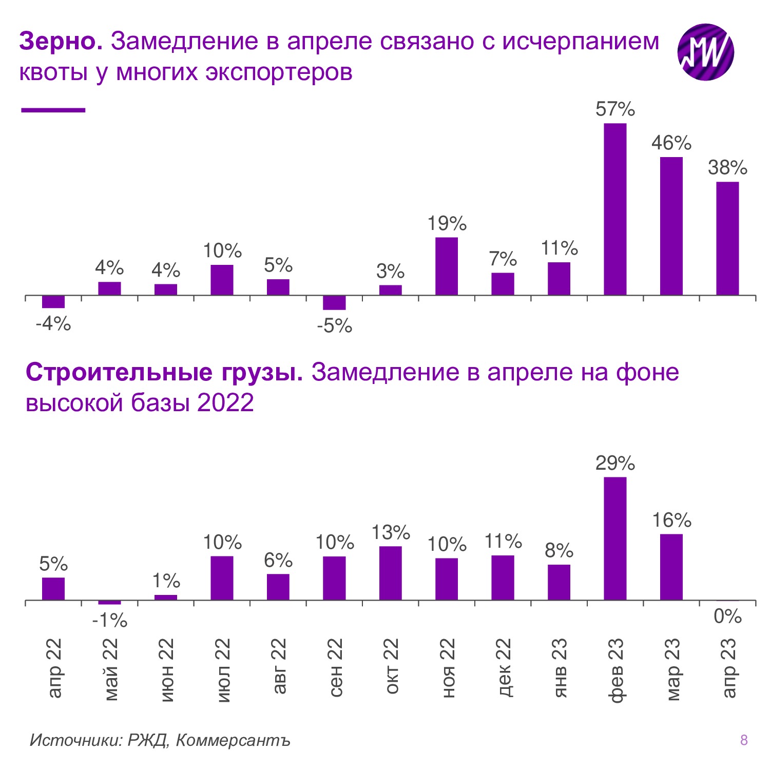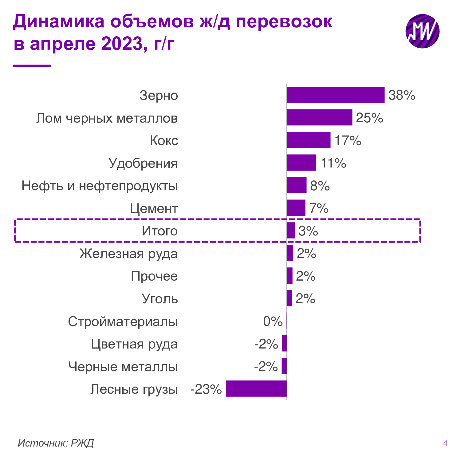 🌾 Лидеры роста. Значительный рост объемов в апреле продолжило демонстрировать зерно (38% г/г). Позитивно для РусАгро (сохраняем нейтральный взгляд на акции компании).