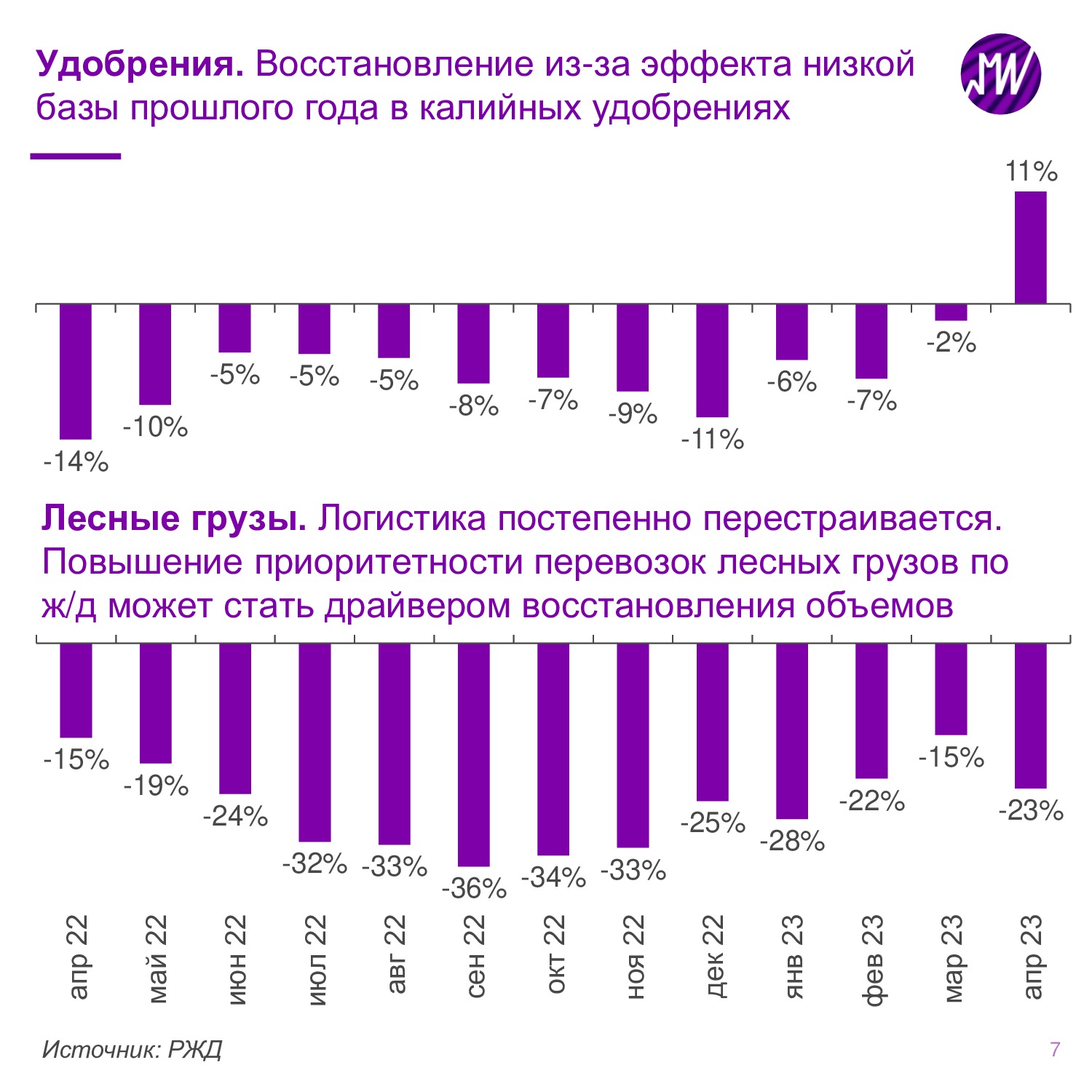 🌱 Удобрения. Рост объемов в апреле (+11% г/г vs -2% в марте) произошел за счет эффекта низкой базы по калийным удобрениям. В фосфатных удобрениях все остается стабильно с точки зрения объемов: сохраняем консервативный взгляд на Фосагро. Придерживаемся негативного взгляда на акции Акрона и Куйбышевазота на фоне значительного падения цен на азотные удобрения и переоцененности компаний по мультипликаторам.
