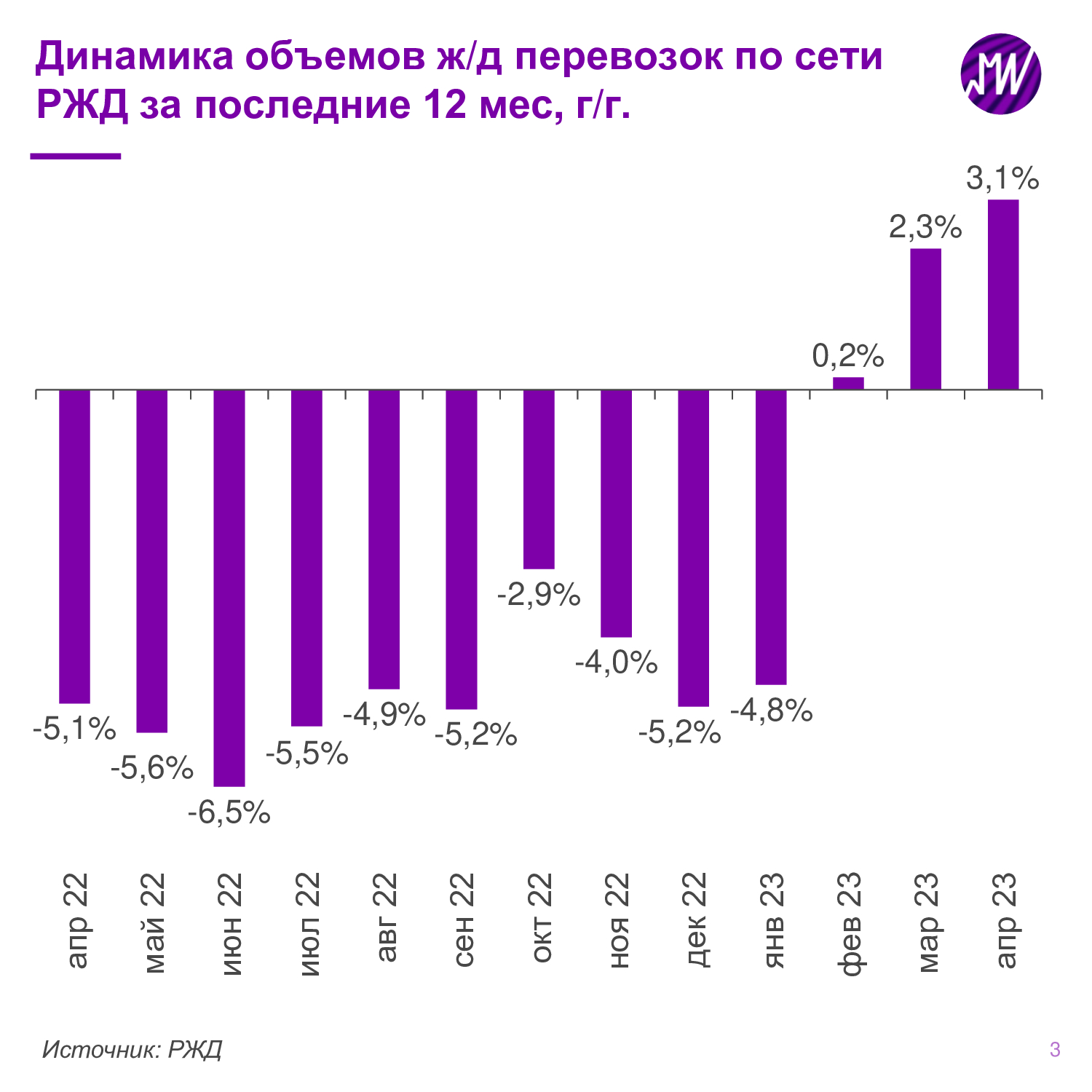 🌲 Лесные грузы. В апреле наблюдалось ухудшение динамики (-23% vs -15% в марте). Увеличение приоритетности перевозки лесных грузов по ж/д в ближайшем будущем может привести к нормализации логистики и восстановлению объемов. Сохраняем умеренно-позитивный взгляд на акции Сегежи.