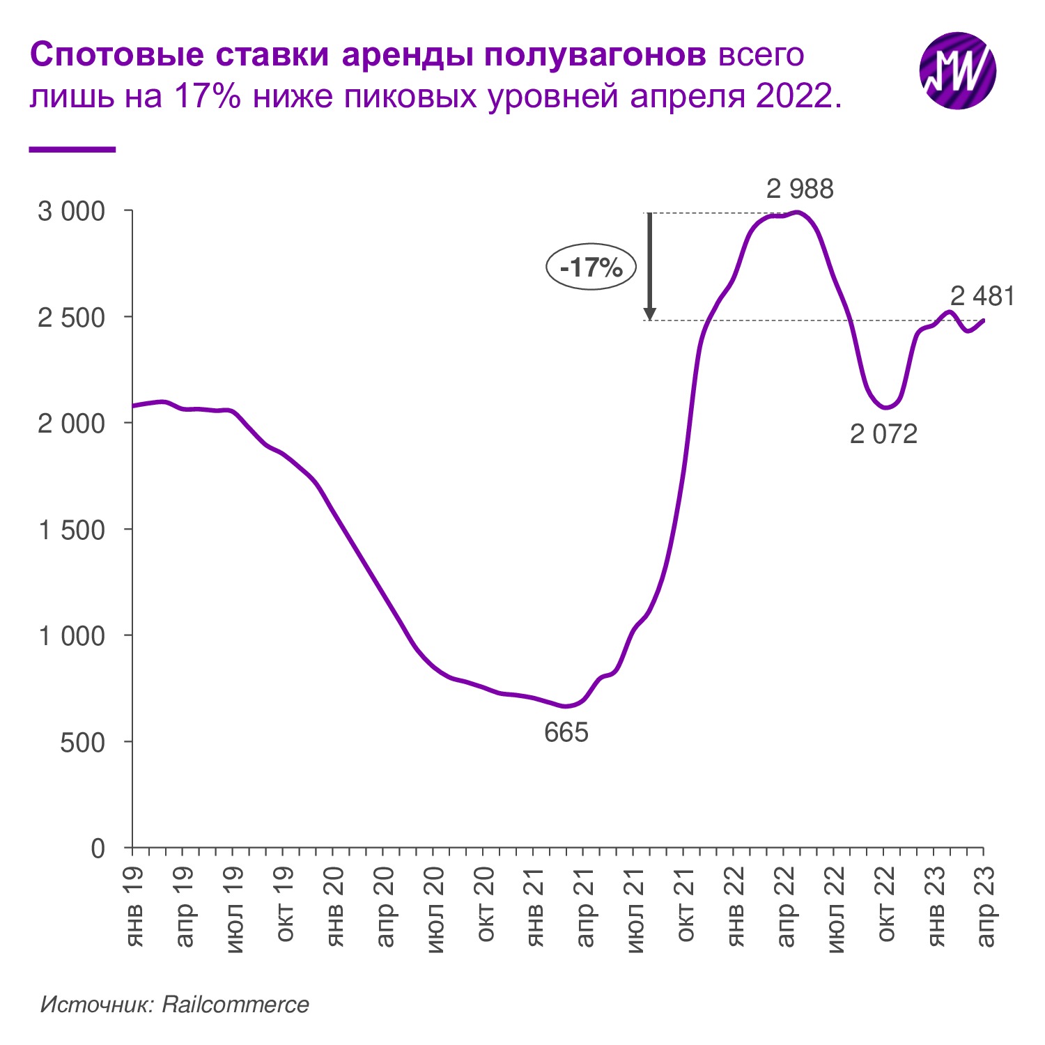🚂 Globaltrans. Рост объемов грузовых ж/д перевозок, а также сохранение спотовых ставок аренды полувагонов на высоком уровне (2 481 руб / день, на 17% ниже максимумов 2022) позитивно для Globaltrans.