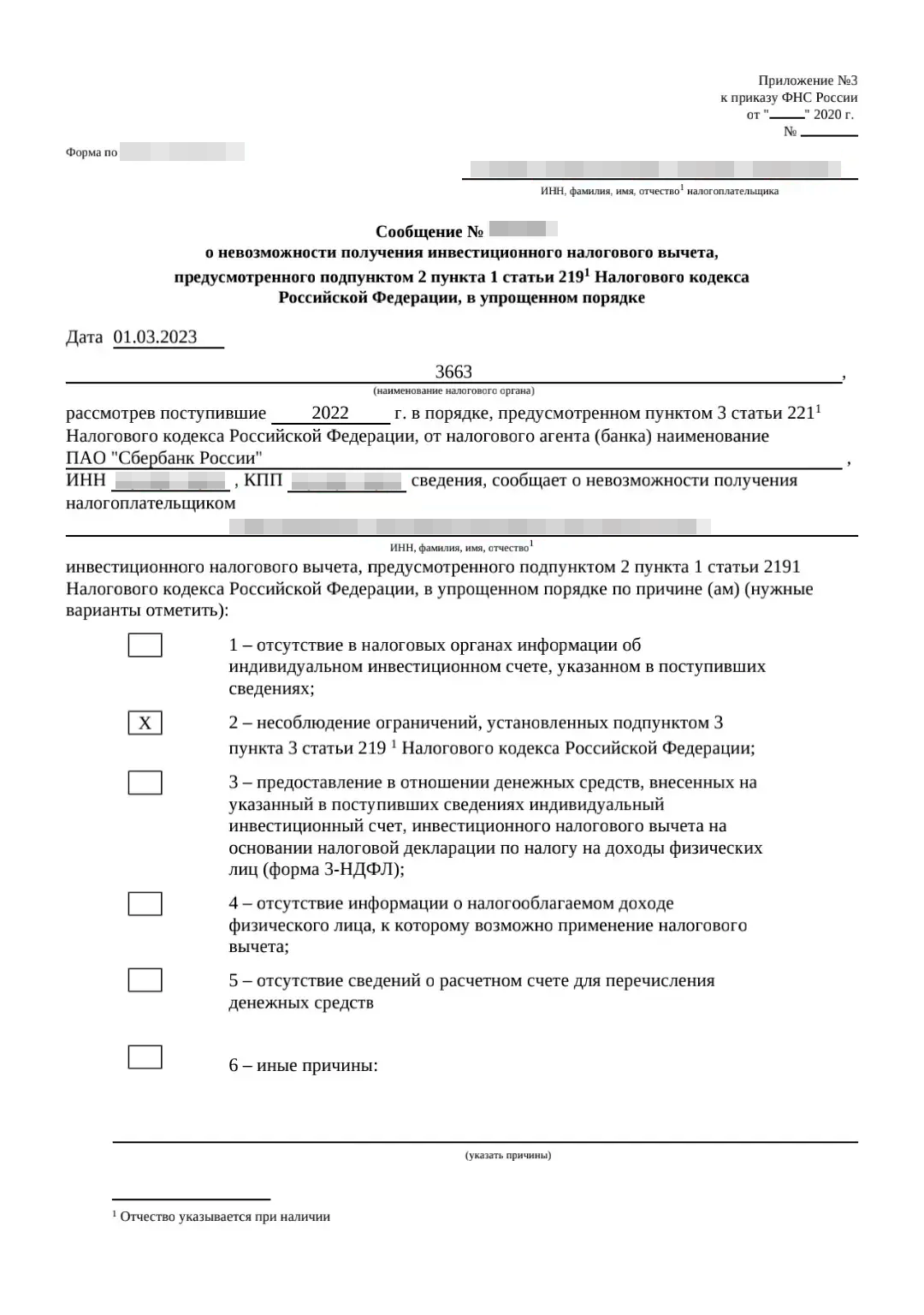 В зависимости от этого выбора в течение трех дней брокер подает в налоговую инспекцию сообщение с признаком 1, если ИИС новый, или с признаком 2, если ИИС открыт с целью перевода от другого брокера.