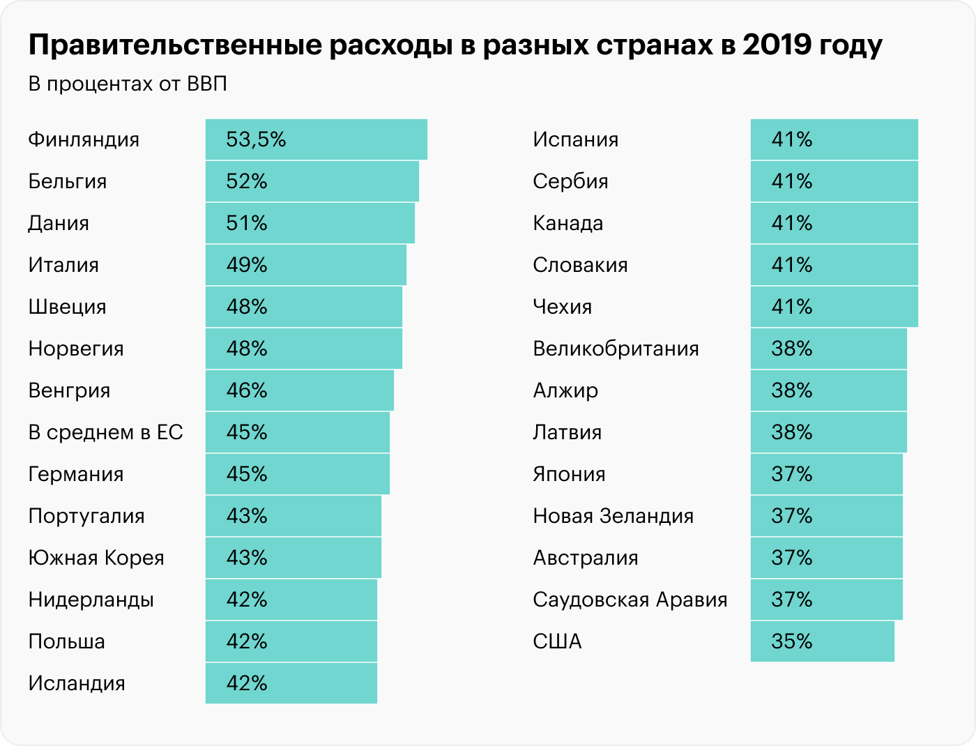 Государство участвует в экономике, но не мешает ей. Финляндия, Дания, Швеция и Норвегия — в числе стран с самым сильным влиянием государства на экономику. В 2019 году госрасходы там составляли около половины объема ВВП. Это наиболее показательный период, потому что потом многие страны мира стали тратить гораздо больше денег из-за коронакризиса.
