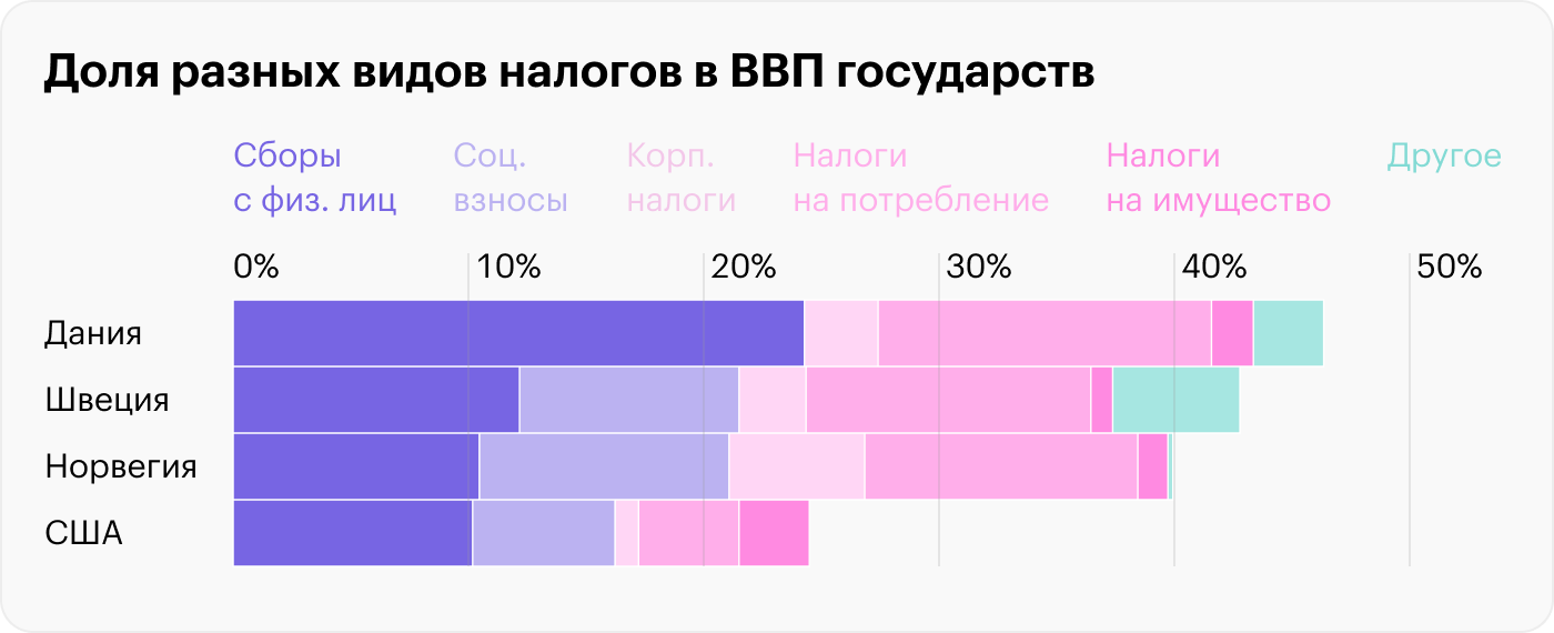 Налог на прибыль корпораций в скандинавских странах при этом ниже среднего по планете — 22% против среднемировых 23%. То есть основное налоговое бремя приходится именно на население, которому также приходится платить НДС и социальные взносы.