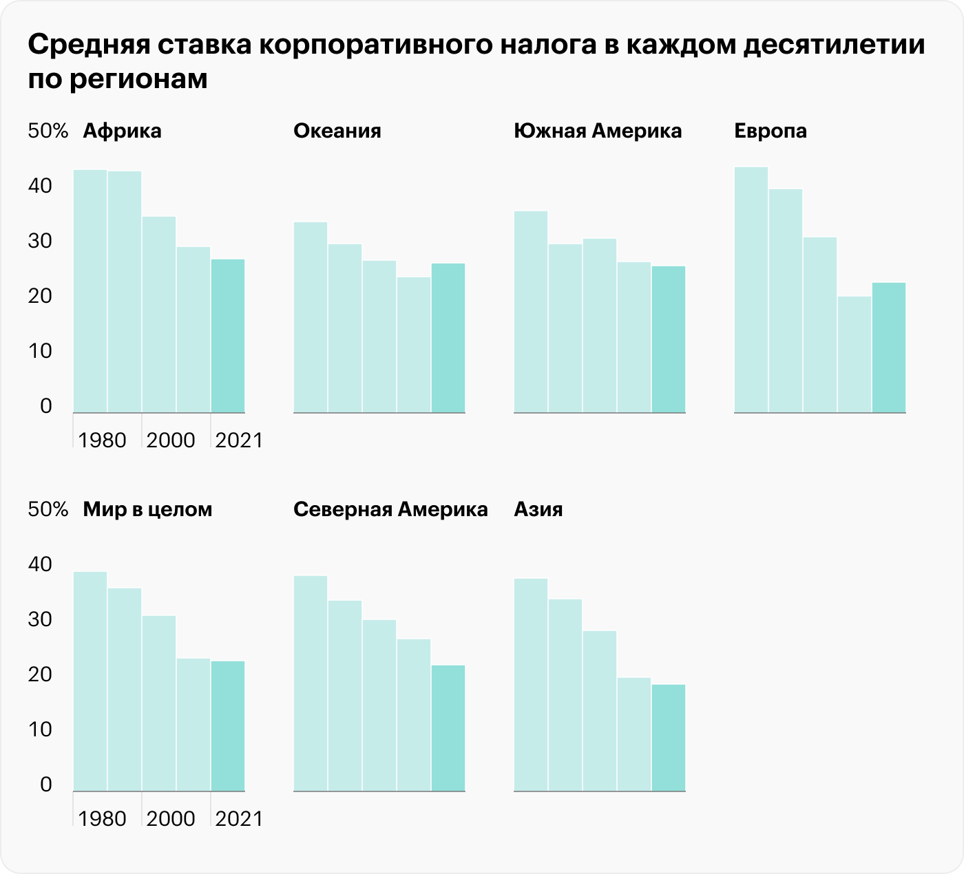 Корпоративные налоги остаются высокими. Ставка корпоративного налога во всех регионах планеты последние 40 лет снижается, но в самых развитых капиталистических экономиках мира — Западной Европе и США — налоги на прибыль корпораций все же остаются выше среднего