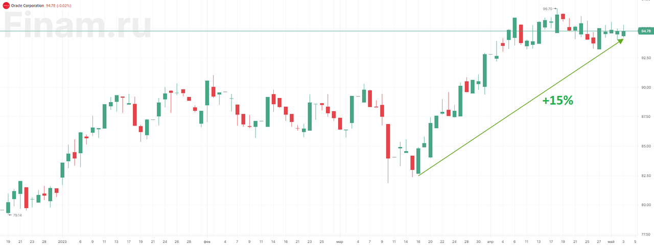 Идея по акциям Oracle от 17.03.2023 принесла 15% доходности за полтора месяца. Oracle является ярким представителем стоимостных компаний, несмотря на принадлежность к IT-сектору. Бумаги достаточно устойчивы к рыночной волатильности и имеют бета-коэффициент 0,99. Сохранение стабильных темпов роста бизнеса в период замедления роста мировой экономики делает Oracle хорошую службу. По результатам 3 квартала 2023 фингода с окончанием 28 февраля Oracle отчиталась о росте выручки на 18% г/г, как и двумя кварталами ранее. Такие же темпы роста ожидаются и по итогам полного 2023 фингода. Двузначный рост глобальной облачной индустрии создает для Oracle прочный фундамент для долгосрочного роста. В 3 квартале выручка облачных сервисов компании возросла на 45% г/г, в том числе за счет поглощения Cerner в прошлом году. Апсайд до нашей целевой цены $105,60 составляет 11%. Сохраняем по акциям рейтинг «Покупать».