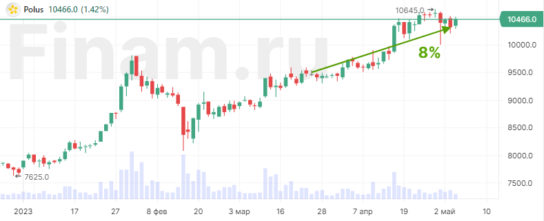За короткое время с выхода нашей идеи от 24 марта 2023 г. на покупку акций «Полюса» они выросли в цене на 8%, чему способствовали высокая эффективность компании, а также рост мировых котировок золота. «Полюс» крупнейший производитель золота в России и один из ведущих в мире, с самой низкой себестоимостью, крупнейшими запасами и большим потенциалом роста объемов добычи. В 2023 г. компания рассчитывает увеличить добычу не менее чем на 10%, а в перспективе 4-5 лет, с освоением крупнейшего месторождения Сухой Лог, можно ожидать роста добычи более чем в 1,5 раза. «Полюс» реализует золото на внутреннем рынке по ценам, привязанным к мировым, и менее уязвим к прямому воздействию санкций. Драйвером для роста акций в 2023 г. также может стать возобновление компанией выплаты дивидендов. Наш рейтинг акций «Полюса» - «Покупать» с целевой ценой 12 034 руб. и потенциалом роста к текущей цене 17%.
