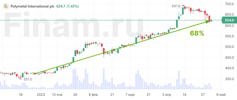 Наша идея на покупку акций Polymetal от 27 декабря 2022 г. принесла доход в размере 68%. Акции компании демонстрируют сильный восстановительный рост после сильного падения в прошлом году из-за большой доли во free-float иностранных инвесторов, распродававших российские акции, который сочетается с динамикой цен на золото и серебро. Компании удалось сохранить добычу, выстроить собственную экспортную логистику и восстановить объемы продаж. Polymetal работает над сменой регистрации с о. Джерси на более дружественную юрисдикцию. Редомициляция позволит компании вернуться к выплате дивидендов, снизит структурные риски, что остается драйвером для акций Polymetal наряду с ростом стоимости драгметаллов. Мы сохраняем за ними рейтинг «Покупать» с потенциалом роста около 23% до нашей целевой цены 773,7 руб.