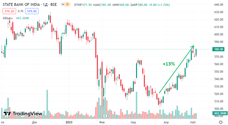 С момента выпуска идеи от 24 марта 2023 г. и по 4 мая 2023 г. акции State Bank of India (SBI) принесли инвесторам доходность в размере 13%. Темпы экономического роста Индии в ближайшие годы, как ожидается, будут составлять 6-6,5% и по-прежнему будут существенно превышать среднемировые. На таком фоне следует ожидать сохранения высокого спроса на финансовые услуги в стране в долгосрочной перспективе, и мы рассчитываем, что это продолжит поддерживать финпоказатели SBI, учитывая лидирующую позицию банка в секторе.