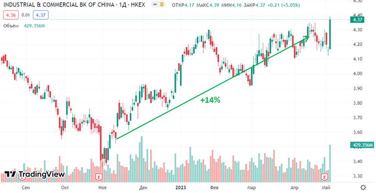 С момента выпуска идеи от 11 ноября 2022 г. и по 14 апреля 2023 г. акции Industrial and Commercial Bank of China (ICBC) класса Н принесли инвесторам доходность в размере 14%.