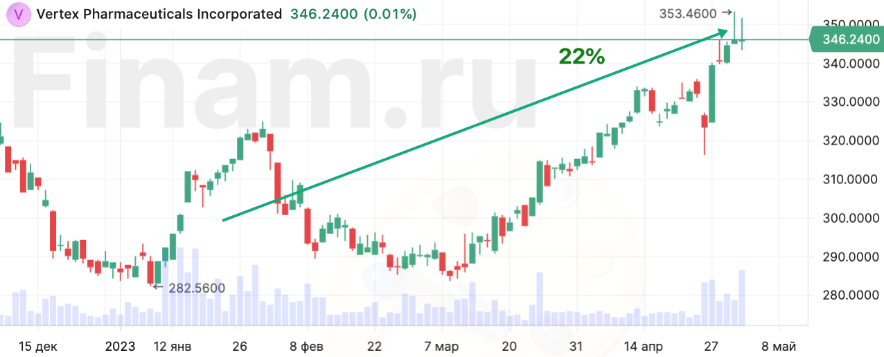 Акции американской биофармацевтической компании Vertex Pharmaceuticals за период с нашего последнего обновления их целевой цены (11 января 2023 года) принесли солидную доходность - 22% по состоянию на утро 5 мая, то есть, за 114 дней.