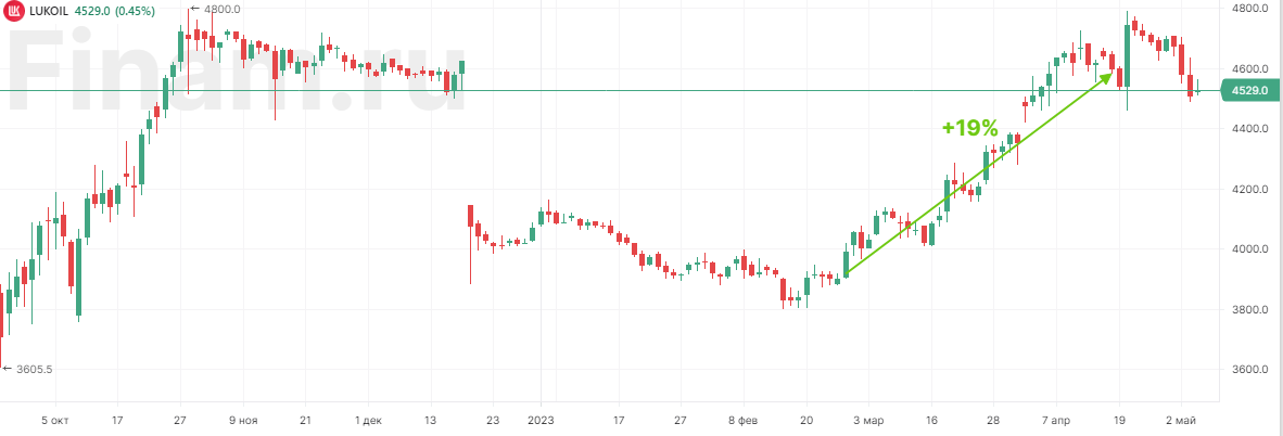 С момента нашего последнего обновления целевой цены (28 февраля 2023 года) по 18 апреля акции «ЛУКОЙЛа» выросли на 19% и достигли нашей целевой цены. Сильная динамика была связана с ростом рублёвых цен на нефть в первой половине апреля и ожиданиями по рекомендацию высоких финальных дивидендов за 2022 год. При этом после достижения целевой цены мы снизили рейтинг по акциям «ЛУКОЙЛа» до «держать». На фоне коррекции мировых цен на нефть, снижения объёма демпферных платежей и недавнего умеренного укрепления рубля мы считаем акции «ЛУКОЙЛа» оцененными справедливо на данный момент.