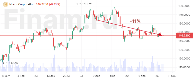 С момента выхода нашей идеи на продажу акций Nucor от 10 февраля 2023 г. котировки этих бумаг упали на 11% и сохраняют потенциал снижения еще на 6,6% до нашей целевой цены $136,6 за акцию. Это сильная сталелитейная компания, она продолжает расширять свое присутствие на различных сегментах американского рынка металлопродукции, однако сейчас рыночная оценка Nucor, на наш взгляд, выглядит завышенной. Отчетность последних двух кварталов обозначила отрицательную динамику продаж и выручки. Поскольку цены на металлопродукцию в 2023 г. вряд ли вернутся на экстремальные пики последних лет, мы ожидаем заметного снижения прибыли компании по сравнению с двумя предыдущими рекордными годами. Падение акций Nucor сдерживается большой программой buyback: в 1 кв. 2023 г. компания выкупила около 2,7 млн своих акций по средней цене $156,35 шт. При этом в программе осталось еще около $656,9 млн, что позволяет выкупить еще до 4,5 млн акций по текущей цене.