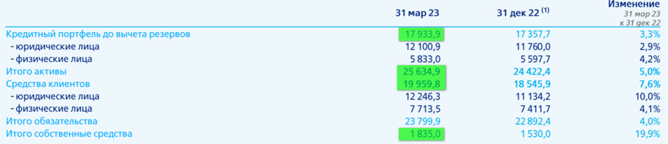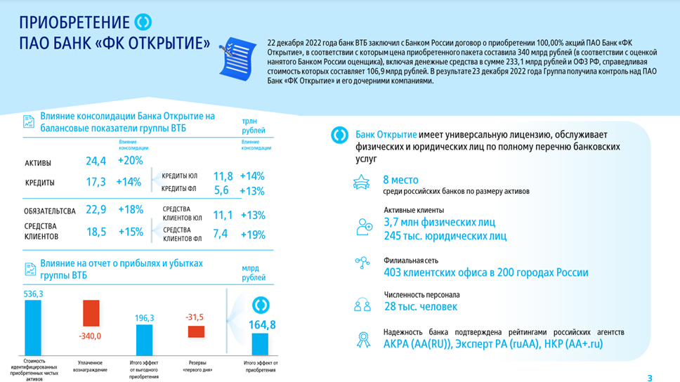 Из позитивных новостей выделю приобретение в конце декабря 2022 года за 340 млрд банка «Открытие». Это прибыльный банк, который занимает 8 место по размеру активов. Разовый эффект от приобретения составил почти 165 млрд. Активы выросли на 20%, а кредиты на 14%.
