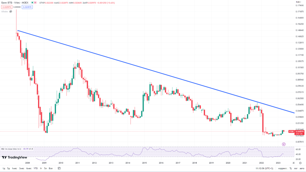 ВТБ провёл IPO 16 лет назад. И практически с начала размещения акции находятся в даунтренде, потеряв к данному моменту 85% стоимости. Но конечно за это время были и отскоки, за которые акции прибавляли десятки и даже сотни процентов в относительно короткий срок.
