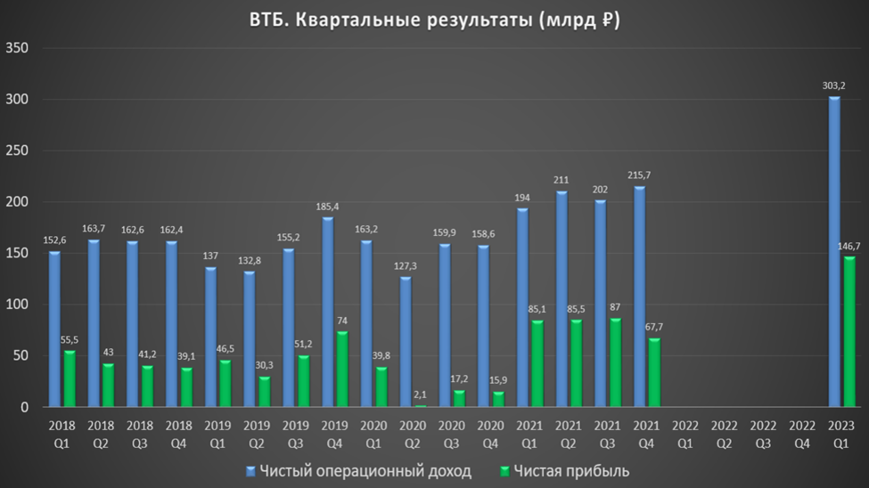 Теперь вкратце проанализируем результаты за 1 квартал 2023 года. Здесь уже абсолютно другая картина. Чистые процентные доходы 173 млрд. Чистые комиссионные доходы 42 млрд. Эффект от приобретения РНКБ 35 млрд, доход от операций с валютой 61,5 млрд. В итоге, чистый операционный доход 303,2 млрд. А чистая прибыль 146,7 млрд.
