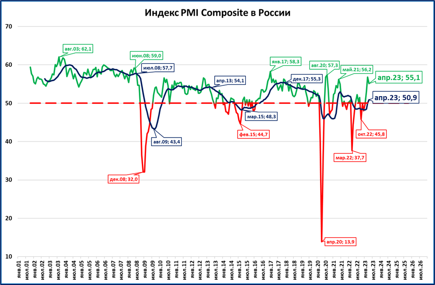 Композитный индекс (55,1 пункта), объединяющий промышленность и услуги, тоже на высоком уровне.