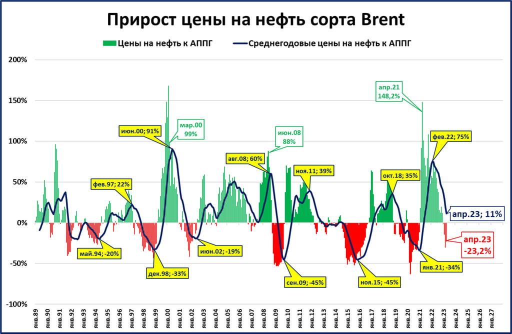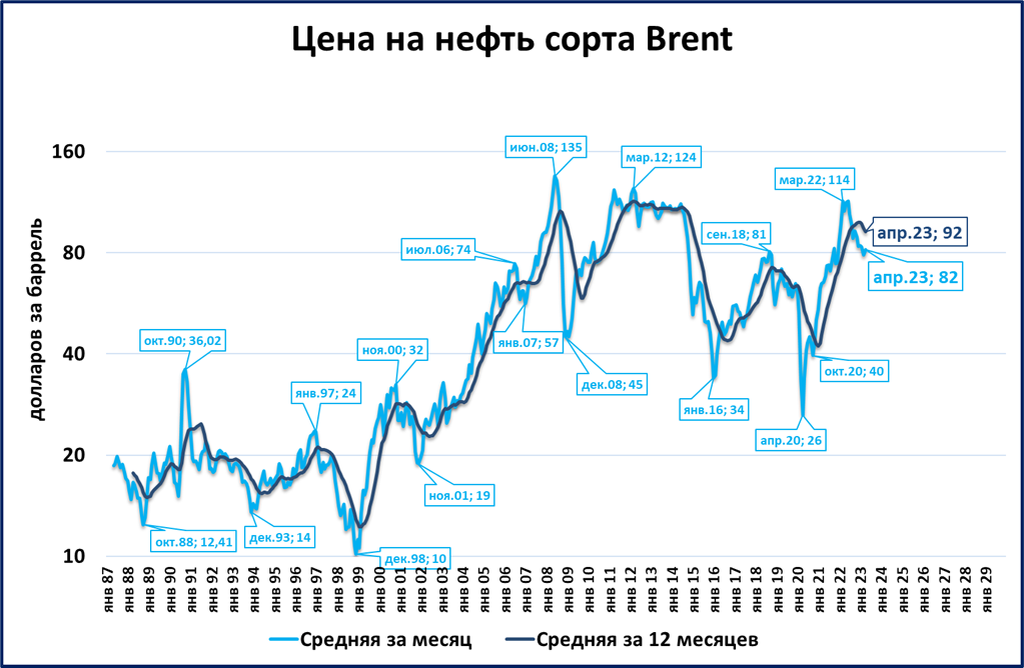 ● Средняя цена нефти сорта Брент в апреле составила 82 доллара за баррель (-23% годовых).