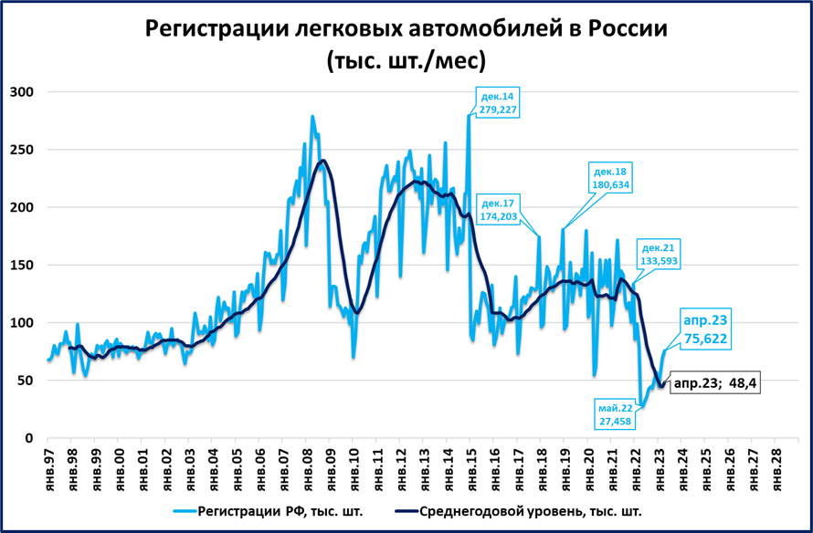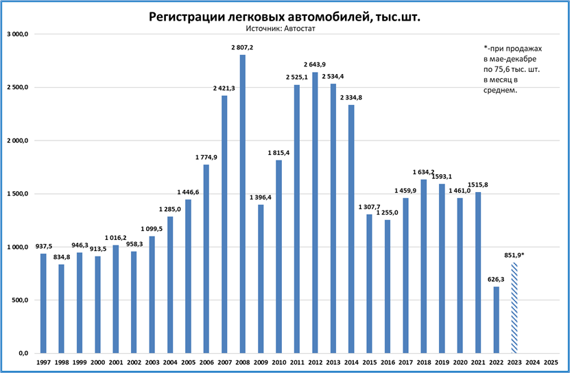 Даже если представить, что рынок в оставшиеся 8 месяцев "застрянет" на отметке 75,6 тыс. шт. в среднем в месяц, то по итогам 2023 года он вырастет до 851,9 тыс. (+36%).