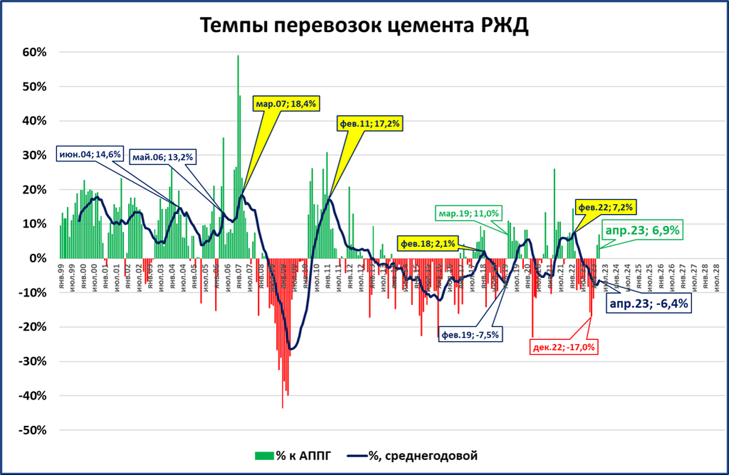 Низшей точкой по объёмам в этом цикле стал февраль. Рост перевозок цемента косвенно отражает рост активности в строительной сфере.