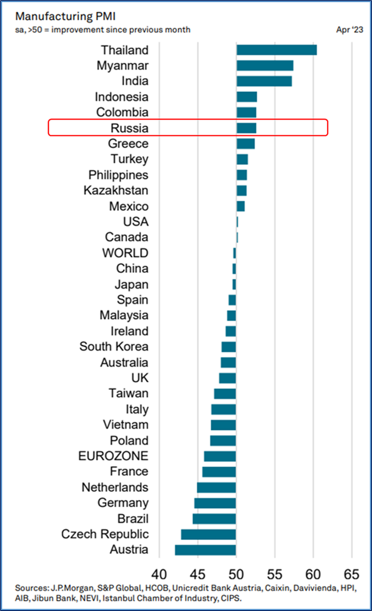 ● Деловая активность в России растёт как в обрабатывающей промышленности, так и в секторе услуг.