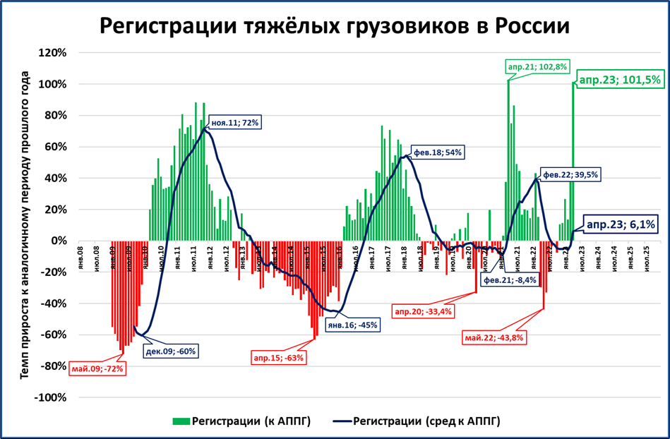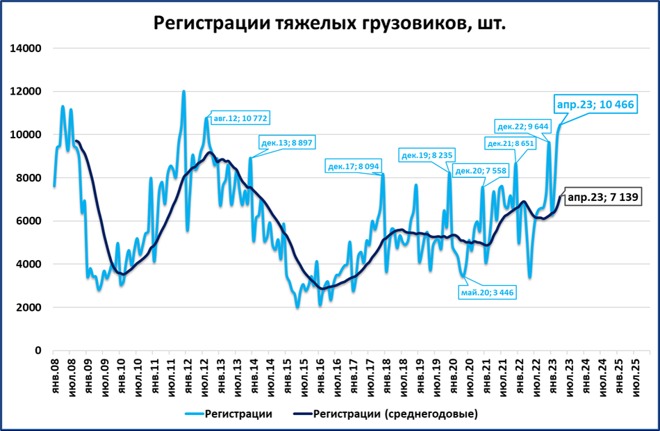 ● Рынок грузовиков вырос в апреле в 2 раза и превысил отметку 10 тыс. шт. в месяц впервые более чем за 10 лет (с августа 2012).