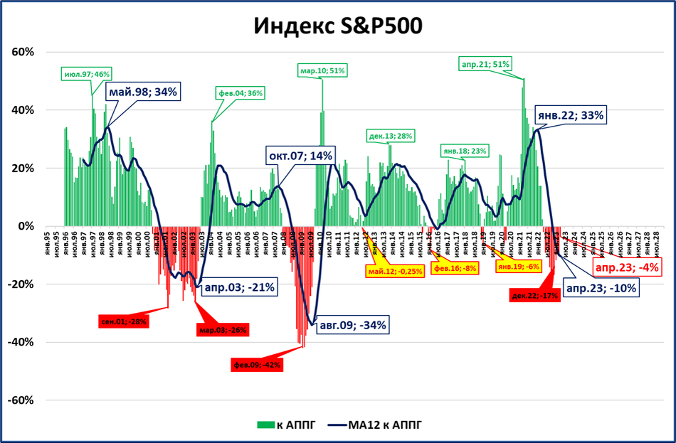 ● Американский фондовый индекс S&P500 в апреле падал уже 12-й месяц подряд. Темпы падения были максимальными в декабре 2022 года (-17% годовых). В апреле падение замедлилось до -4%.