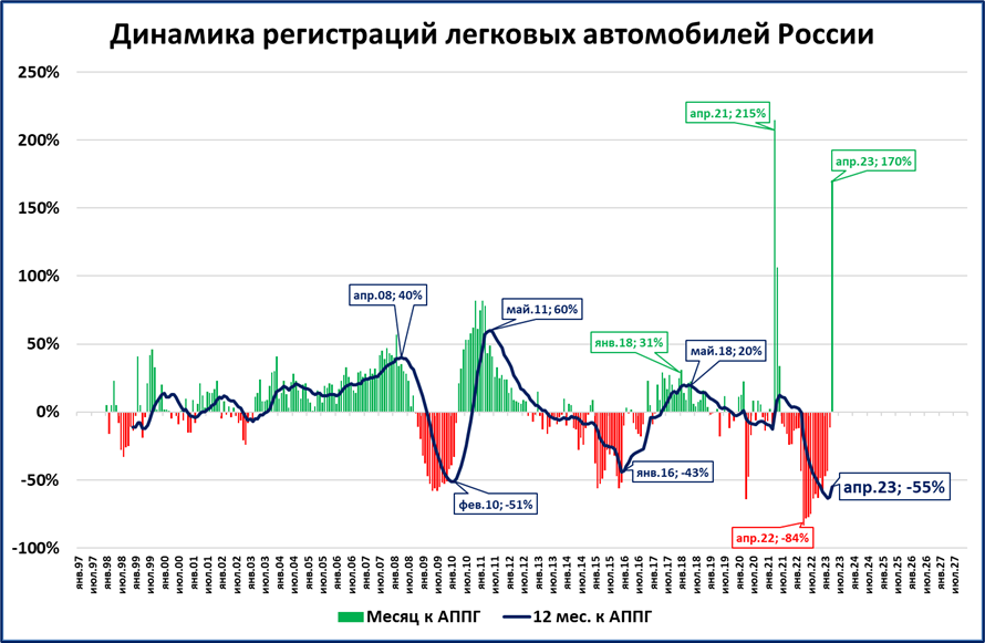 Рынок легковых автомобилей с апреля прошлого года (28 тыс.) постепенно восстановился до 76 тыс. в апреле нынешнего года.