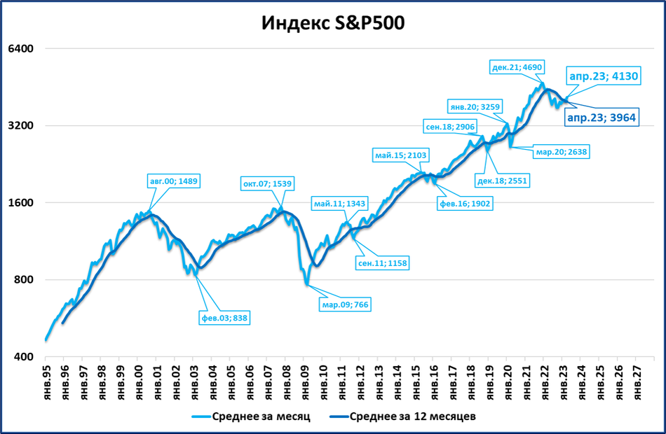 В апреле среднее значение индекса S&P500 составило 4130 пунктов.