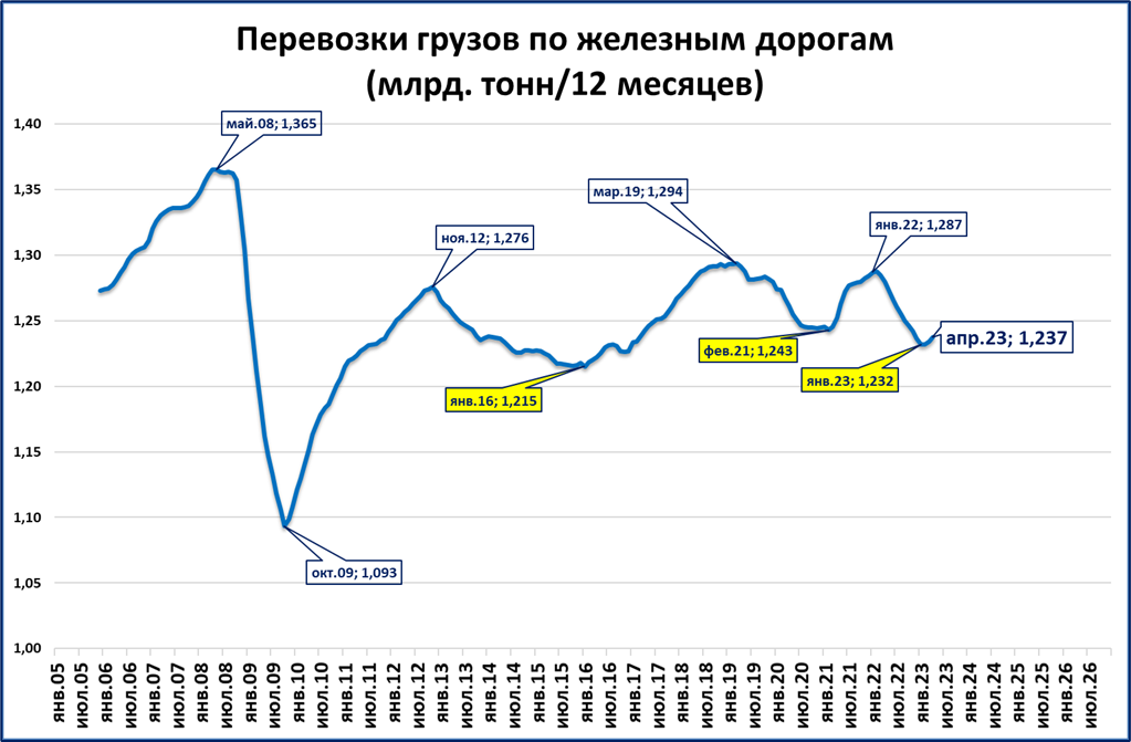 Перевозки за последние 12 месяцев (скользящий год) по итогам апреля выросли до 1,237 млрд. тонн.