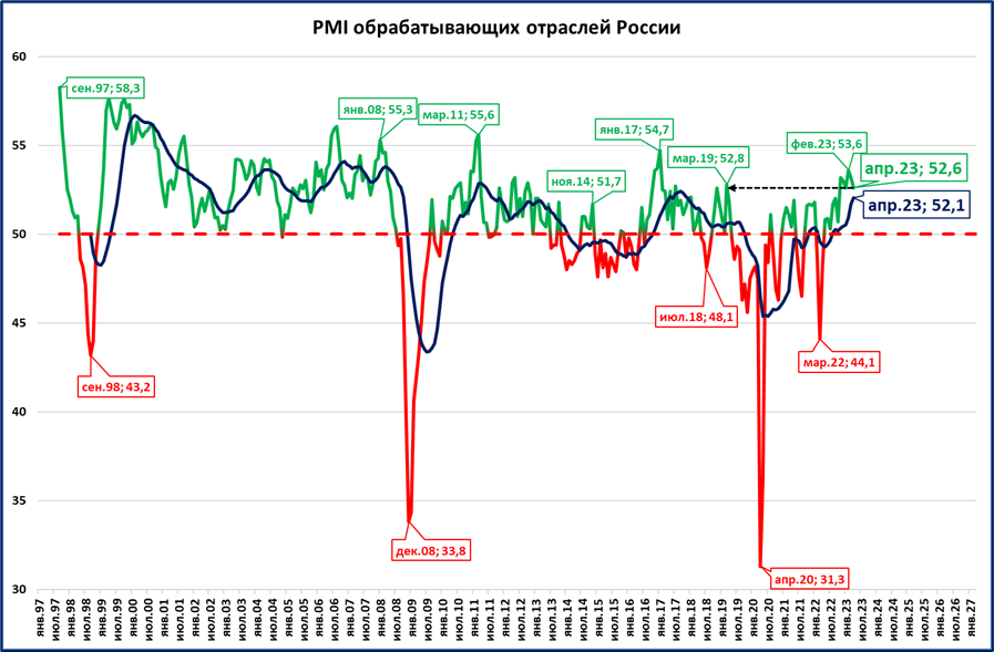 Индекс деловой активности в обрабатывающей промышленности России снизился до 52,6 в апреле, но остаётся выше 50 пунктов (= рост деловой активности).