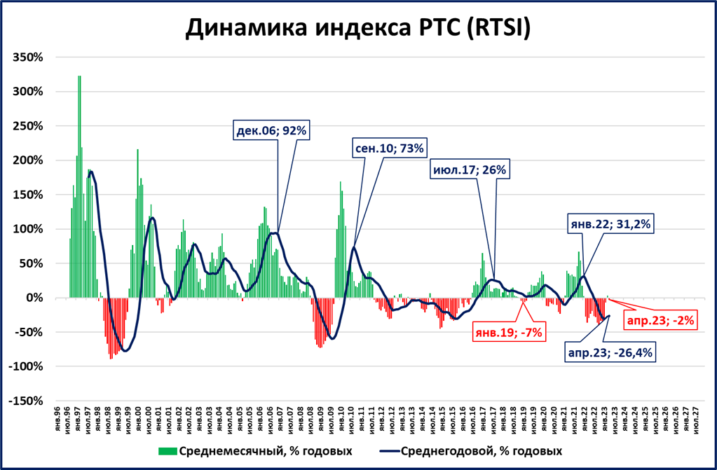Важно: такой признак является необходимым, но не достаточным условием выхода из “медвежьего” рынка. Так в начале 2002 года темпы падения тоже замедлялись и были лучше среднегодовых темпов. В марте 2002 года падение замедлилось до символических -2%. Но после этого замедления падение возобновилось с новой силой.