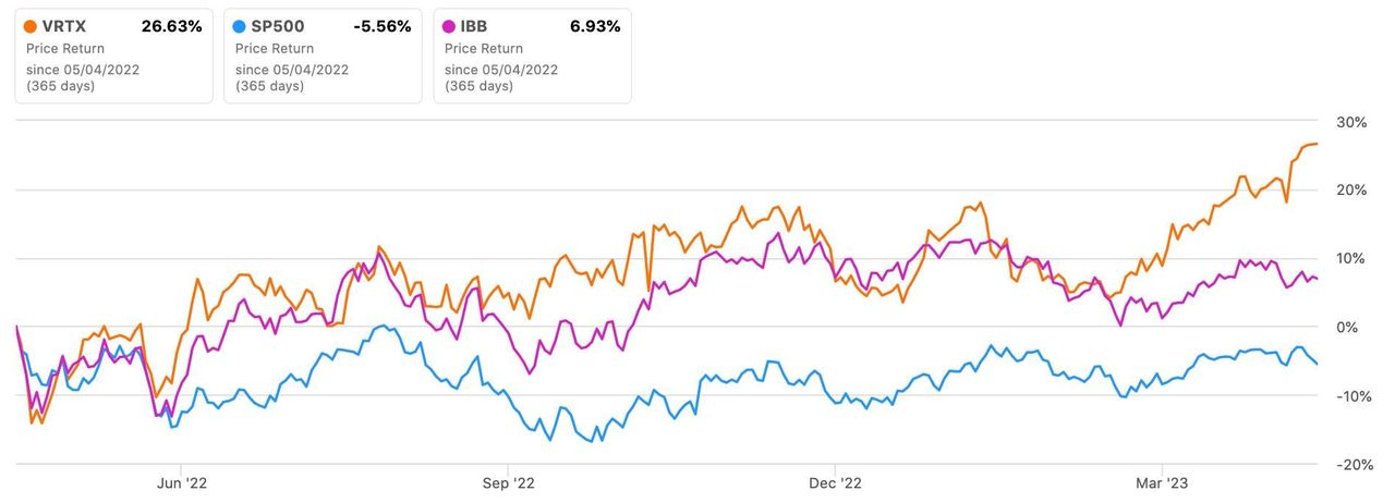 Акции Vertex Pharmaceuticals за последние 12 месяцев уверенно опережают по доходности и индекс S&P 500, и биотехнологический индексный фонд iShares Nasdaq Biotechnology ETF. Доходность бумаги за год составляет 27% в условиях падающего рынка – S&P 500 за аналогичный период просел на 6%. Доходность iShares Nasdaq Biotechnology ETF за год составляет 7%.