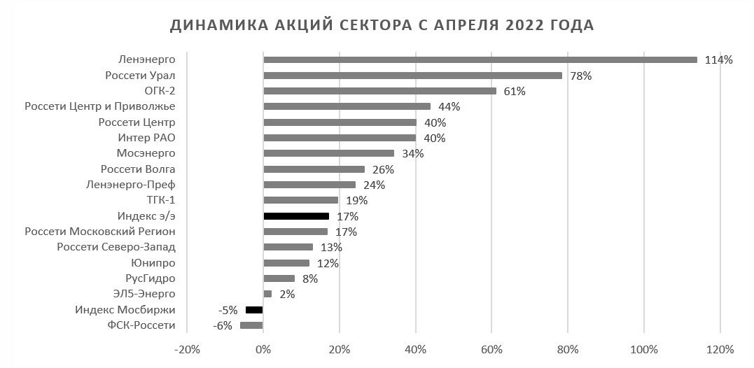 Индекс электроэнергетики с апреля 2022 года заметно опережает Индекс МосБиржи, прибавив за период 17% против падения широкого рынка на 5%. Финансовые результаты представителей сектора подтверждают тезис о том, что отрасль довольно быстро приспособилась к ограничениям со стороны западных стран, непосредственный эффект которых на чистую прибыль был минимален.
